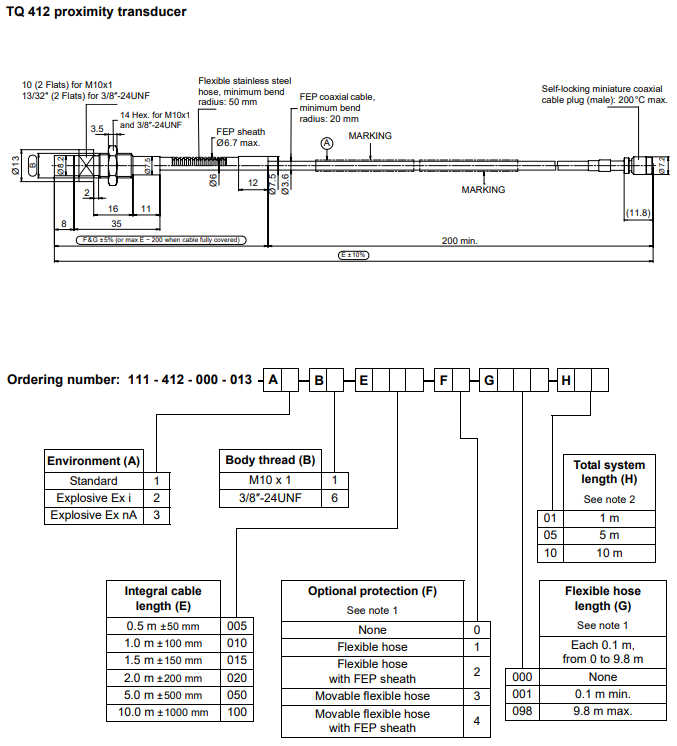 The transducer body is available with metric or imperial thread. The TQ 412 version is intended for reverse-mount applications. The TQ 402 / 412 has an integral coaxial cable, terminated with a self-locking miniature coaxial connector. Various cable lengths (integral and extension) can be ordered